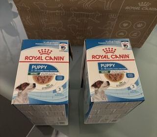 En raison de la stérilisation de mon petit teckel il a changé d'alimentation aussi je me retrouve avec ces deux boîtes neuves non ouvertes : 24 sachets aliment humide pour chiots