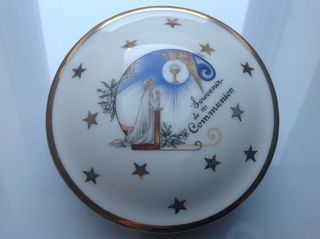 BOITE PORCELAINE SOUVENIR DE 1ère COMMUNION SIGNÉE EN TRES BON ETAT. BOITE A BIJOUX BOMBÉE EN VÉRITABLE PORCELAINE SOUVENIR DE 1ère COMMUNION SIGNÉE LF. DIMENSIONS : 6,2 cm D