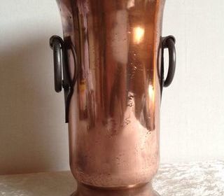 SUPERBE VASE EN CUIVRE ÉPAIS, POIGNÉE FER FORGÉ. CRÉATION JEAN GOARDÈRE, MEILLEUR OUVRIER DE FRANCE ET COUPE D'OR DU BON GOÛT FRANÇAIS. HAUTEUR : 21cm, DESSUS : 12cm. Paie