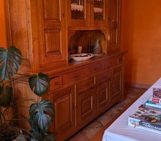 A vendre salle à manger type campagnard en bois massif composée d'une table avec deux bancs, d'un buffet bahut et vaisselier, d'un confiturier, d'un meuble tv. Un ensemble robuste