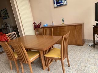 A vendre salle à manger type campagnard en bois massif composée d'une table avec deux bancs, d'un buffet bahut et vaisselier, d'un confiturier, d'un meuble tv. Un ensemble robuste