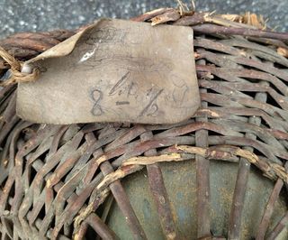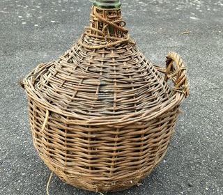 Bonbonne ancienne Marie-Jeanne de forme ronde, d'une contenance de 8.5 litres, avec son bouchon et dans son panier d'osier complet. Dimensions 30 cm diamètre * 40 cm de hauteur.