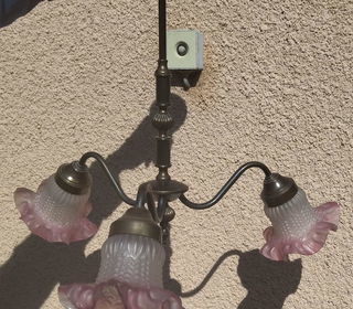 Magnifique suspension en laiton comportant trois fleurs en verre dépoli blanc et rose, chacune abritant une ampoule. Lustre vintage typique du style floral des années 1920. Très