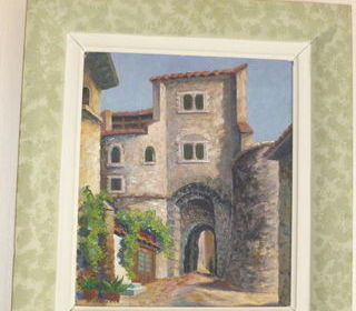 Vends un tableau représentant une porte de ville, dite Porte des Ormeaux, et les deux tours qui la flanquent, à Cordes-sur-Ciel (81, France). Il est signé par le peintre Mortemart.