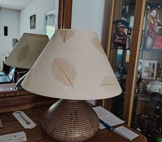 Lampe de chevet avec pied en grès robuste et esthétique avec abat jour motif feuilles pour une ambiance cosy moderne et bohème.