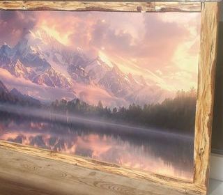 Tableau avec cadre en bois Je vends ce magnifique cadre mural en toile représentant des montagnes et lac au coucher du soleil. - Type de produit : Cadre mural - Matière : Bois / to