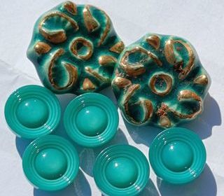 Lot 15 Boutons Couture Vintage - N°62 9 Triangles Émeraude & 6 Turquoises Striés Ensemble graphique et coloré pour vos projets de couture. Ce lot propose des formes orig