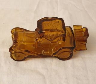 Ancien flacon de Lotion après-rasage, d'une contenance de 180 ml, en verre de couleur ambrée, en forme de voiture. Objet vintage distribué par Avon Packard Roadster, dans les anné