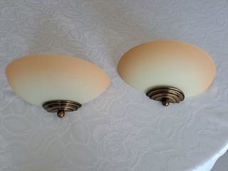 Vends 2 appliques murales pour intérieur - en verre de couleur jaune/ocre dégradé - supports en laiton doré - en forme de demi-lune incurvées. Belle diffusion de la lumière dou