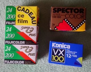 Lot de 5 pellicules périmées une 36 poses Spector 100 iso Color une 12 poses Konica VX 100 12/135 une 3 x 24 poses Fujicolor Super G Plus 200 iso Toutes périmées depuis 1999