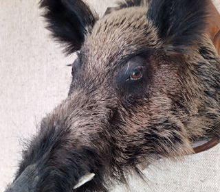 Vends lot 4 trophées de chasse : Tête de sanglier + Bois de daguet + Support pattes de chevreuil + plateau.avec bois de chevreuil. 1) Tête de sanglier naturalisée sur son écusso