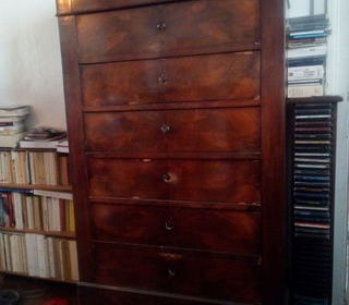 Belle commode haute à 7 tiroirs (le 7e, sous le plateau, est moins haut que les autres) Plateau en marbre Beau bois, marqueterie abîmée par endroits Les clés ne sont pas d