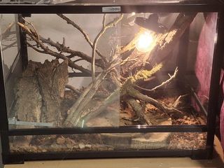 Vend terrarium tout en verre de 6mm 107cm de longueur 110cm de haut 60 cm de profondeur Avec décor et lampe Facile pour l entretien