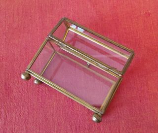 Ancienne vitrine en verre, bordure en laiton, repose sur 4 pieds boule ouverture par le dessus, année 79.80 H 10...l 6...L 11