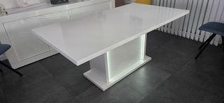 Vends table à manger, bois, blanc, avec led pour décoration. Très bon état. Table de repas de 180 cm. Allonge de 50 cm permettant une longueur de 230 cm, largeur 100 cm. Pied ce