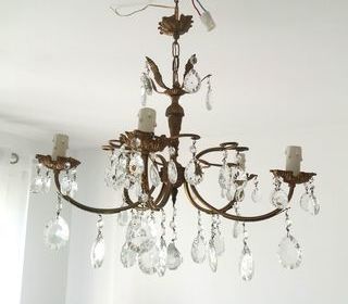 Lustre pampilles en métal doré, un élément de décoration vintage et élégant pour votre intérieur. Joli lustre de belle taille avec pampilles verre 5 branches