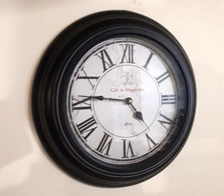 Horloge murale style rétro "Café de Marguerites 1870". Diamètre 43 cm, métal et verre, chiffres romains. Bon état, fonctionne parfaitement. Quelques légères traces d'usure sur