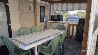 Nbre chambres 2,nbr couchages 4/6,salle d eau, toilette séparée, terrasse couverte, Équipements : 2 TV,1L.V,1M.A.L,plaque vitro,1 four, assiettes,verres ect fournis. Camping 4*