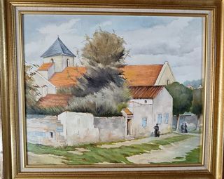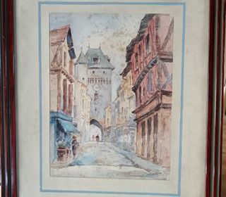Tableau Camille MERIOT (1887-1975) Ruelle animée Aquarelle sur papier Signé en bas à droite Encadré sur verre 26 x 35 cm Rousseurs