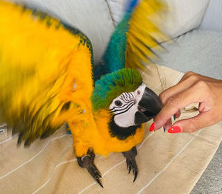 Eleveur capacitaire cède bébé perroquet femelle Ara Ararauna totalement sevré. Bague 2025, EAM élevé à la main, très proche de l'humain, très gentille, seront vendu totalement se