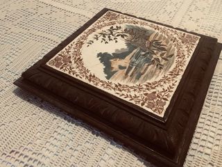 Très beau dessous de plats ancien céramique encadrée de bois sculpté avec petits pieds Excellent état