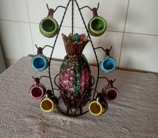 Ensemble de 6 louches en cuivre, manche bois, de 62 à 89 cm de longueur totale, dont un moule à pain de sucre. Excellent état.