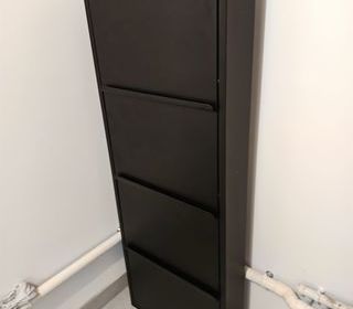 Je vends cette étagère à chaussures en acier noir. - Type de produit : Étagère à chaussures - Matériau : Acier - Couleur : Noir - Nombre de compartiments : 4 - Utilisation : S