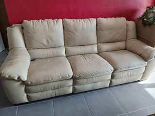 Beau Canapé cuir Salon de 3 places avec pouf assortie. Bon état. Confortable. Siège basculant à son extrémité. Mesures: 2m85 de long, 1m de largeur et 0,90 de hauteur