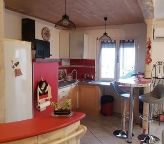Maison rénovée à Pujaut, 7 km d'Avignon, de 160 m2 habitables, rdc plus deux étages. Superficie de la parcelle 185 m2. Rdc : cuisine ouverte sur salle de séjour, salon, bureau ave