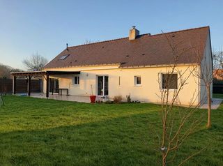 Maison de 141m² datant de 2005 à proximité du bourg (650m) : une entrée, une cuisine ouverte aménagée et équipée, un salon séjour avec poêle à bois et four intégré, une arrière cui