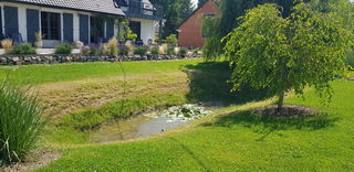 Maison de plain-pied se composant d'une salle-salon, deux chambres, un bureau, une cuisine, une salle de bain avec WC. Il n'y a pas de garage, Plusieurs dépendances complètent le