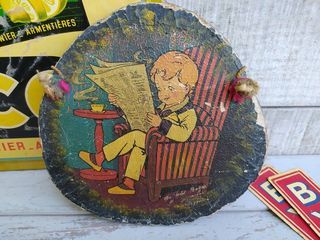 Tableau Publicitaire Litho sur Bois Au Petit Bazar Argenton (Creuse) Signé de l'illustrateur (peu lisible) Hauteur 20cm, largeur 20cm, épaisseur 1cm État : Présence d'us