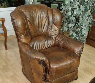 Meubles de salon. Canapé cuir marron convertible. Table basse. Deux fauteuils cuir marron. Bahut-bibliothèque Visible sur rendez-vous