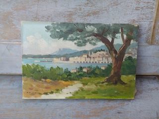 Tableau Paysage Vue d'Antibes Signé Righetti (Édouard Righetti ?) Huile sur toile format 24cm x16cm. Très bon état