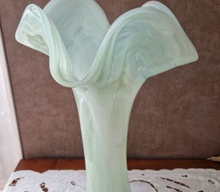 Très joli vase en verre coloré style Murano. En très bon état Il possède un col évasé en corolle Fabrication artisanale Coloris vert laiteux. Peint à la main Diamètre à la base