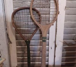 Raquettes de Tennis Anciens Jouets d'Enfant Hauteur 50cm et 40cm. Dans l'état, la petite a été restaurée au niveau du tamis et scotchée sur le manche