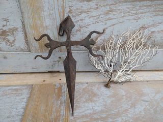 Ancienne Croix Fer Forgé Saint-Jacques Santiago Haute Époque Pèlerin Wrought Iron Cross Origine et période exacte à déterminer. Hauteur 27cm, largeur 19cm, épaisseur 0,7cm. Poids