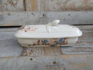 Ancienne Boite Porte Brosse à Dent Porcelaine Thème Floral Longueur 20,5cm, largeur 8cm, hauteur 6,5cm, 8cm avec la prise État : un petit éclat au bord et un cheveux.