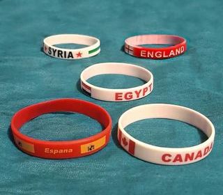 -> 2 € l'unité. Sauf le "England" à 1 € Bracelets mixtes de couleurs. España Canada Egypt England Syria. En silicone caoutchouc épais et souple. Tour de poignet 19cm. Largeur 1