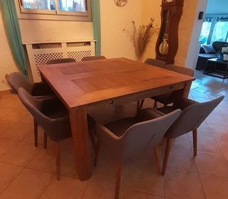 Vend table repas carrée de Cocktail Scandinave modèle "Trinidad" Dimensions : 140 X 140 cm 8 personnes 2 allonges de 50 x 140 cm 16 personnes Dimensions avec les allonges : 14