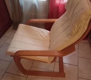 Vends fauteuil blanc cassé avec pieds en bois arrondis très design et très confortable. Très bon état. Remise en main propre.
