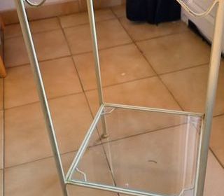 sellette / colonne porte-plante en métal avec plateaux en verre, style un peu romantique / jardin d'hiver / années 90-2000 (feuilles décoratives en fer forgé). pour poser une plan