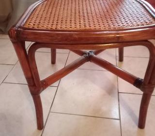 Vends très belle table de salle à manger en bambous avec plateau en bois des îles. Dimensions 90x90 et deux rallonges de 45cm, soit 135x90 ou 180x90cm + 4 chaises en canne assortie