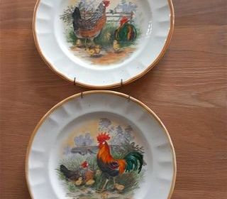 Bonjour, Ensemble d'assiettes coq/poule en porcelaine poussins H. Arndt Crown Staffordshire Ils présentent tous deux l'art de l'artiste Hugh Arndt. L'art est transféré sur le ver