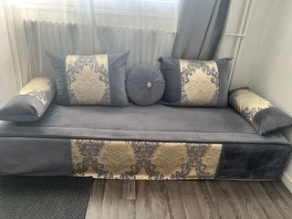 URGENT Bel ensemble pour salon, très tendance oriental/moderne, composé de : 1 matelas : 2 m de longueur, 70 cm de largeur et 30 cm de hauteur 1 surmatelas 2 coussins 2 acco