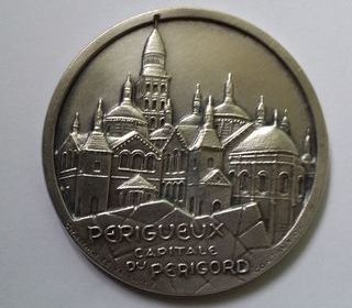 Médaille en métal ( argent plaqué ) . Sur l'avers , la cathédrale Saint-Front . Périgueux capitale du Périgord . Charma valence Contaux . Revers vierge . Bon état . Diamètre