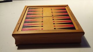 Ancien coffret en bois de 5 jeux de société . Plateau , couvercle , recto verso en bois . Le coffret comprend : Backgammon avec 5 dés , jeu de cartes neuf , 28 dominos en bois ,
