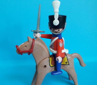 Ancien Playmobil de la garde républicaine , Hussard . Réf : 5580 . Personnage , figurine rouge et bleu avec sa monture ; Cheval marron clair . Pas de paiement en ligne . Prix