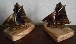 Paire de serre-livres ou presse-papier en forme de voilier en bronze régule doré sur socle de marbre rose. Quelques ébréchures sur les socles et des traces d'usure, ?uvre du tem