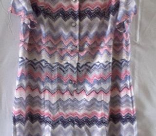 Robe imprimée sans manches, bleue, rose et blanche. Jersey couture Marcelle Griffon. Made in France. Diolen Loft Ouverture sur le devant avec 4 boutons tissus décor rob